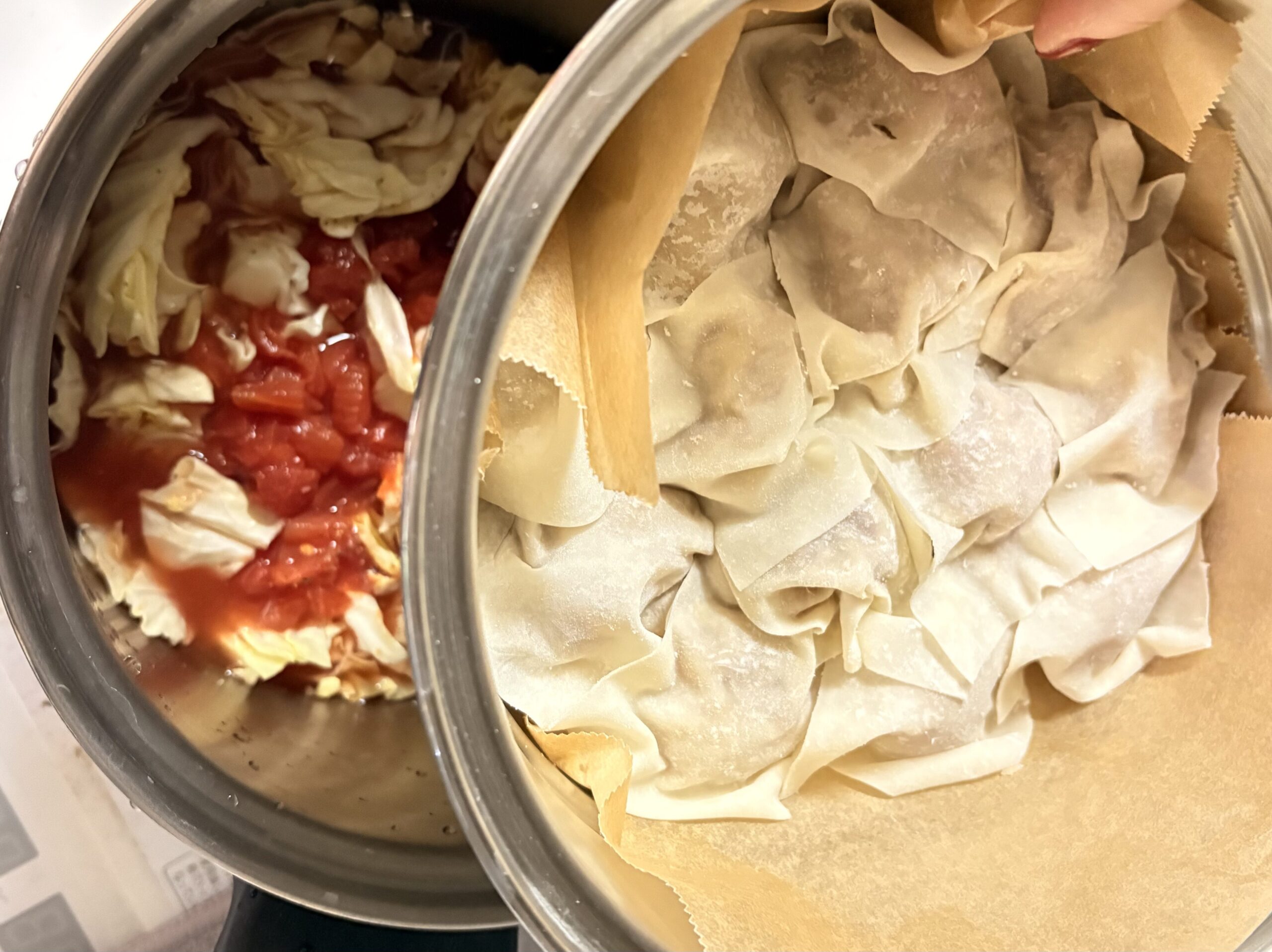 - 下段にトマト缶・あさり・白だし・洋れを入れる
