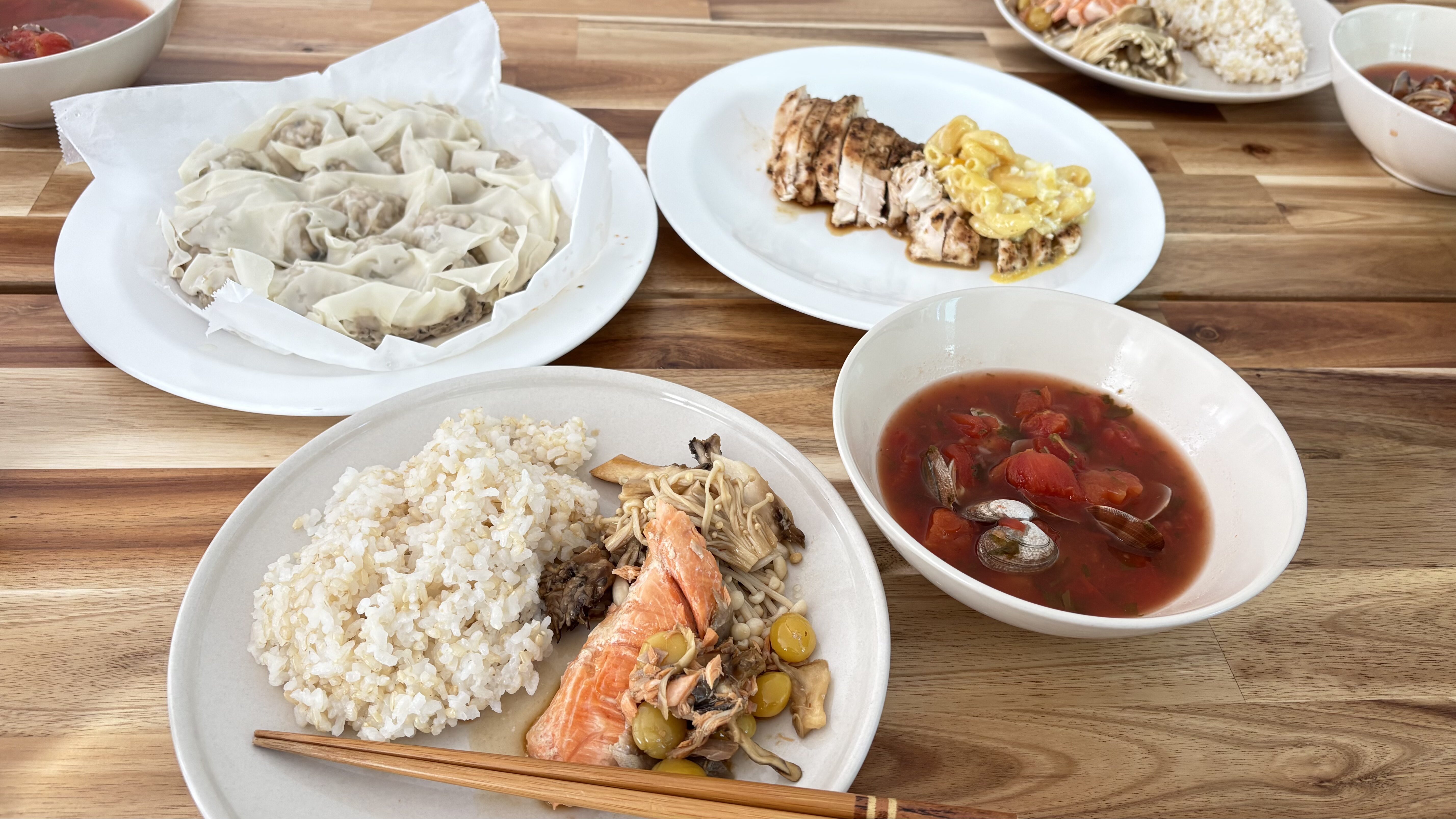 スチーマーや鍋を使えば、1時間で7品、デザートまで作れちゃうので、ちょっとした料理人になった気分!写真のあさりとトマトのスープや包まないシューマイ、鮭ときのこのバター醤+卵サラダ、ふわふわロールケーキ、ぷるぷる鶏ハムも、材料を混ぜて蒸したり焼くだけで簡単に完成します。お弁当用の作り置きにもぴったりです。