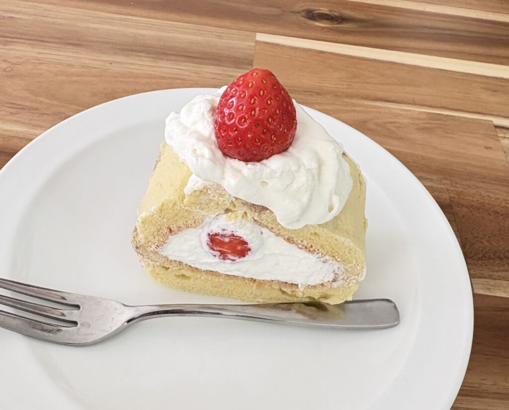 - 焼けたスポンジに、泡立てた生クリーム(生クリーム+砂糖+リキュール)を塗り、好みのフルーツを入れて巻いて、冷蔵庫で少し休ませたら完成。
